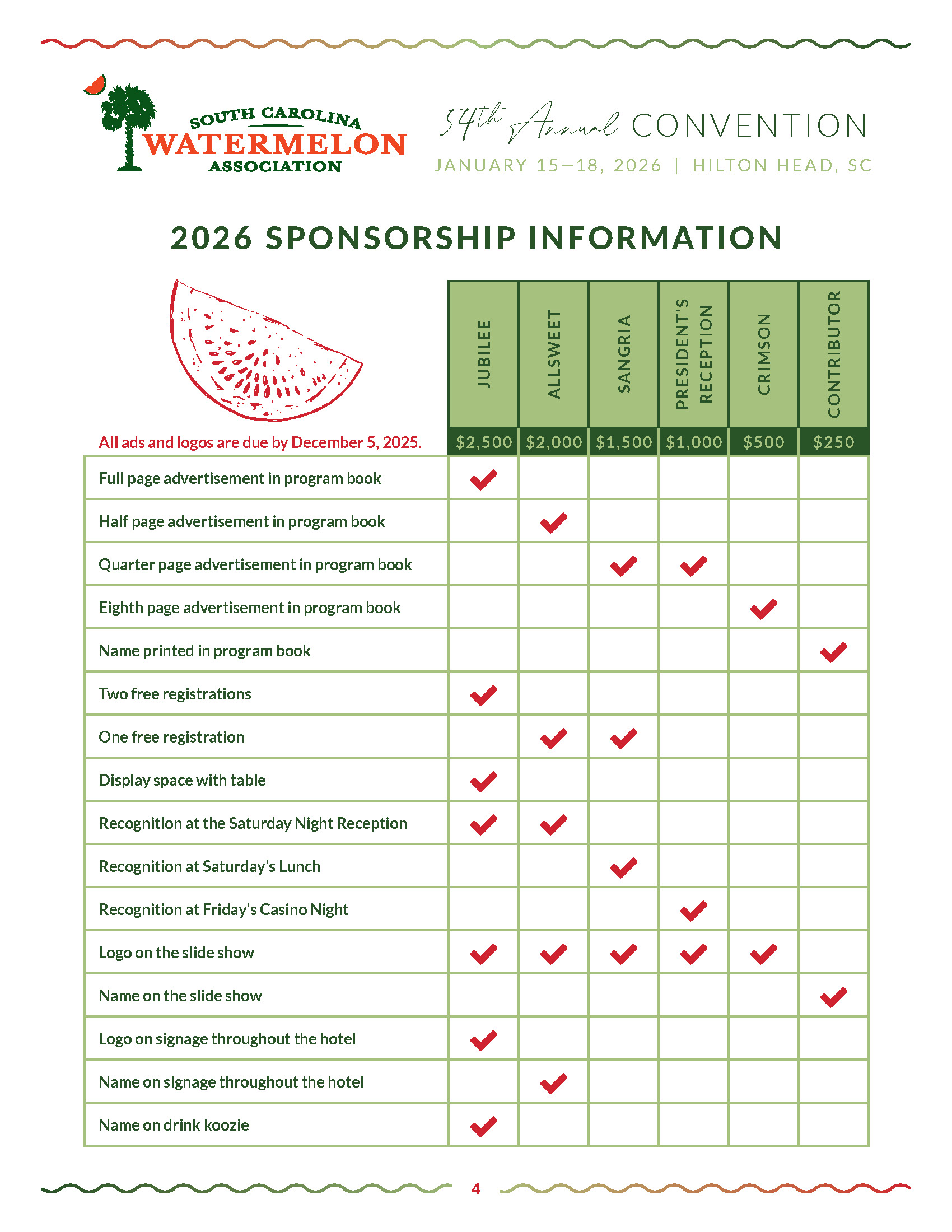 The South Carolina Watermelon Association and its Board of Directors strive to always provide Convention attendees with the best service possible, while also keeping costs at a minimum to ensure an excellent time is had by all. This would not be possible without the dedication and support of ALL our sponsors.